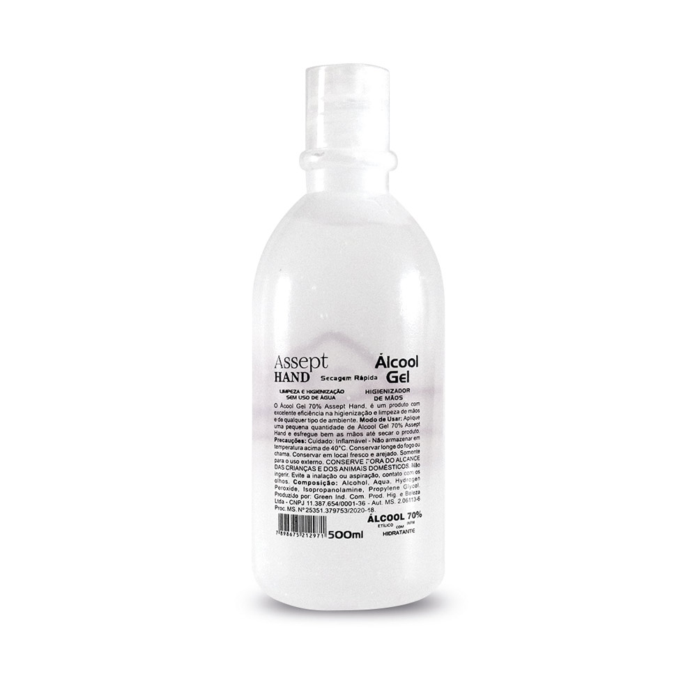 Álcool em Gel 500ml 70% antisséptico para higienização a seco das mãos e braços. Combate 99,9% dos germes e bactérias e hidrata a pele com solução protetora da pele, diminuindo o impacto do ressecamento provocado pelo álcool. Embalagem transparente em PP. Ideal para ter no escritório ou em casa. Instruções de uso: Aplicar uma pequena quantidade de Álcool Gel na palma da mão e espalhar até total absorção, sem enxágue. É recomendada a sua utilização para completar a limpeza rotineira das mãos. Dermatologicamente testado e certificado pela ANVISA. Disponível personalização do frasco com logomarca. ø70 x 200 mm