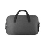 Bolsa esportiva em rPET 600D com interior forrado e fundo com placa semi-rígida. Compartimento principal e bolso frontal com fecho e dois bolsos laterais, um em rede e outro com fecho.