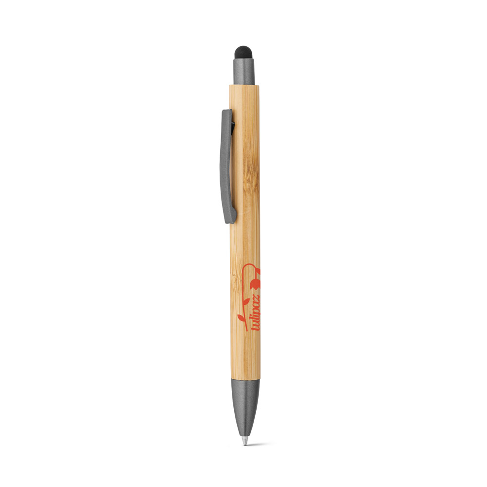 Esferográfica em bambu com clipe em metal e acabamento mate. Possui ponteira touch em cinza metálico para contato apropriado com ecrãs táteis. Escrita a preto. Ø11 x 141 mm