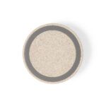 Carregador wireless em ABS e fibra de palha de trigo. A potência de carregamento é de 5W, com entrada 5V/2A. A base contém um círculo em silicone para o equipamento não se mova enquanto carrega. Incluso cabo micro USB de 1 m. Fornecido em caixa presente de papel craft. ø70 x 10 mm